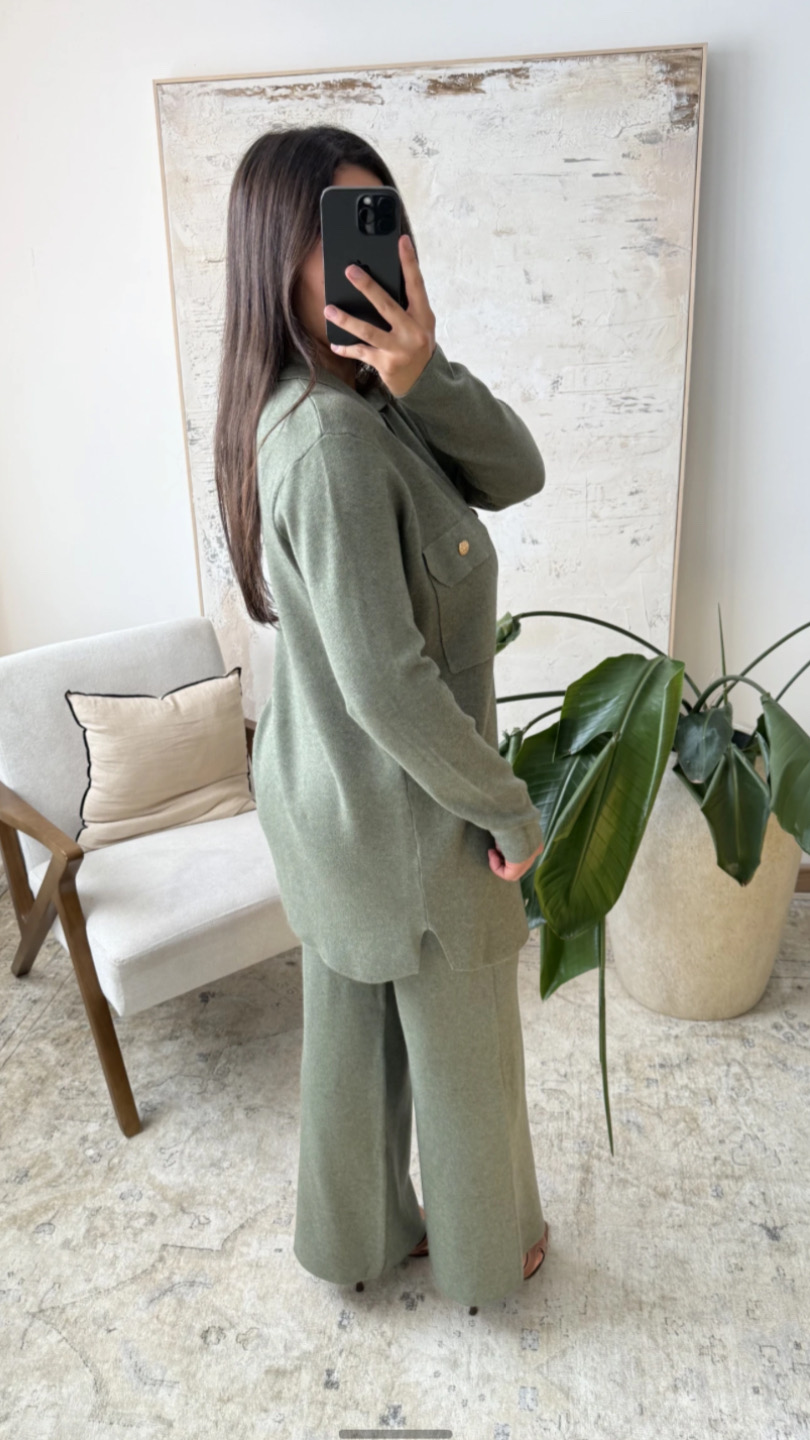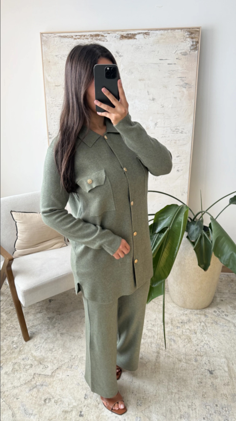 Details: We love comfy… Prachtige 2 delige knit set bestaande uit een lang overhemd met klassieke kraag en gouden knopen. Bijpassende broek met wijde pijpen. Perfecte set voor deze herfst / winter.