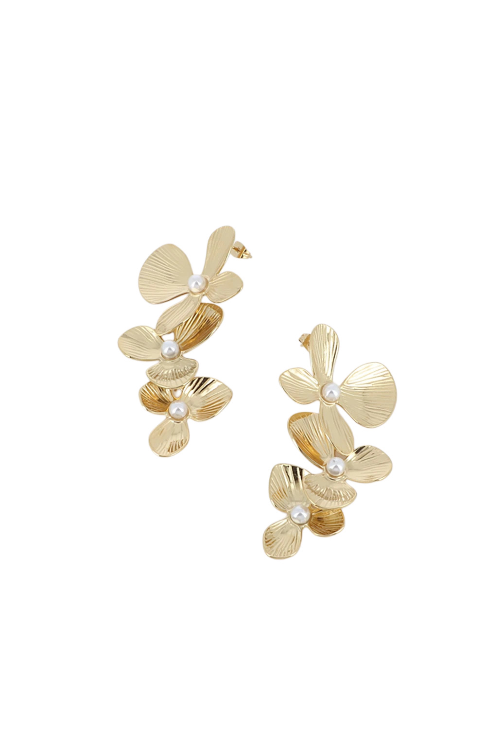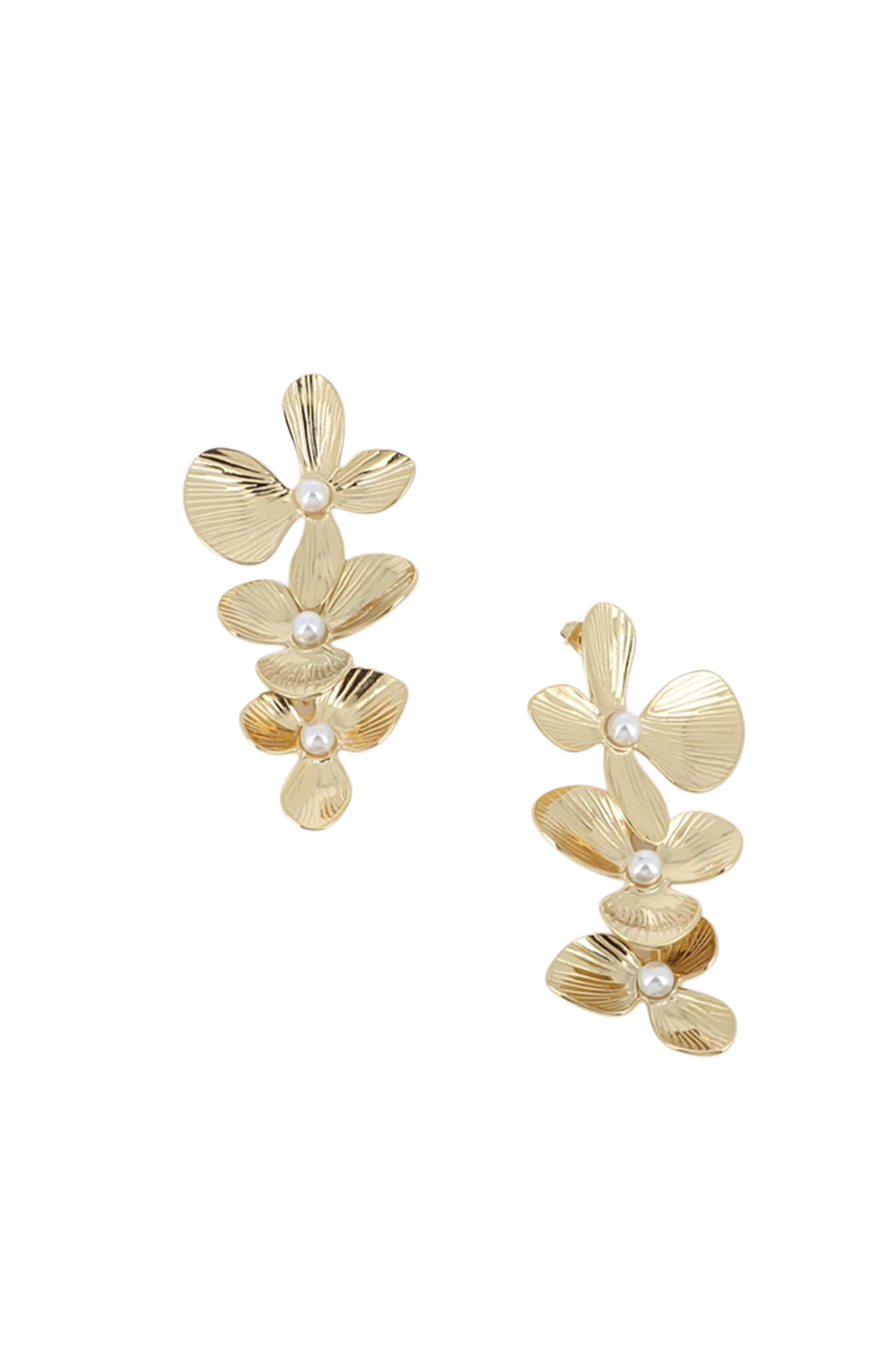 We love accessoires!!  Voeg een vleugje liefde toe aan je look met deze prachtige grote oorknopjes in de vorm van 3 hangende bloemen met kleine pareltjes.
