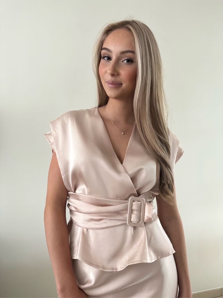 Top heeft een extra touch korte flair mouw, overslag V-hals en taille gesp in dezelfde stof.