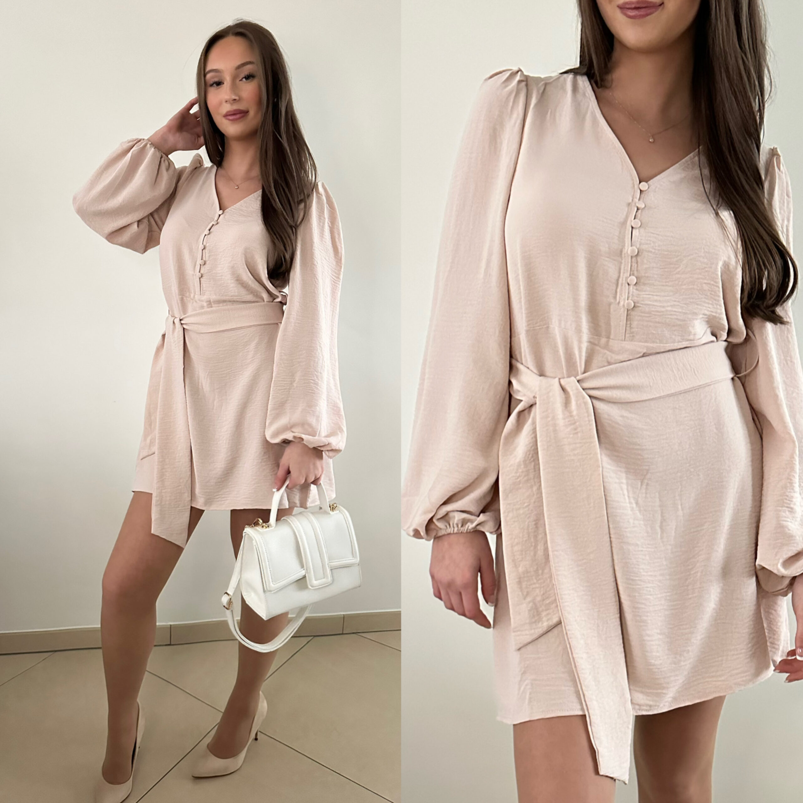 Details: Perfect summer dress. Licht pof balloon mouwen, knoopjes en ceintuur in zelfde stof.